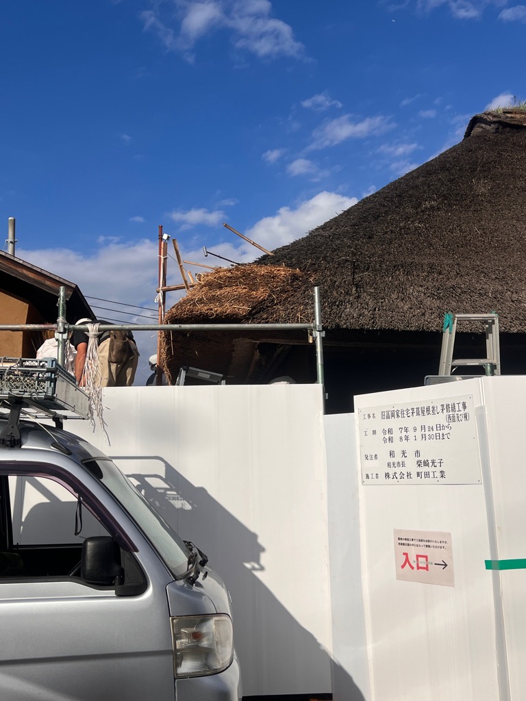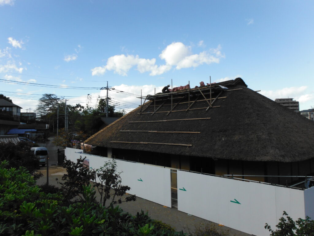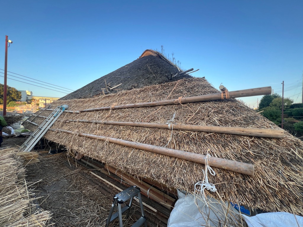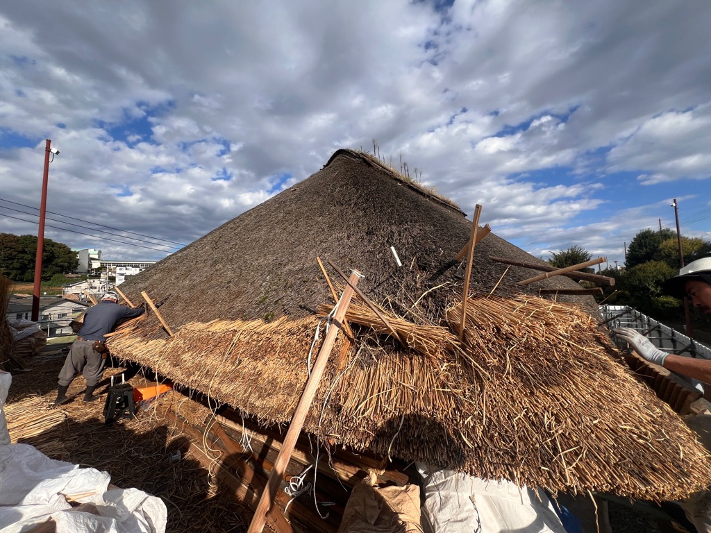 新倉ふるさと民家園では、市指定文化財 旧冨岡家住宅の屋根修繕工事進行中です。