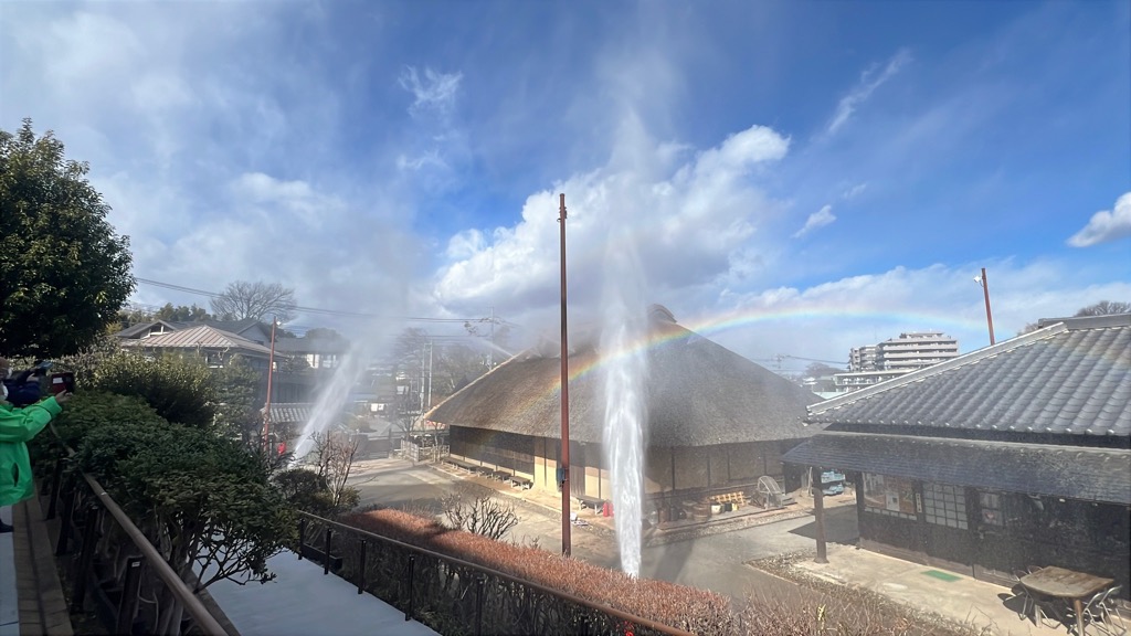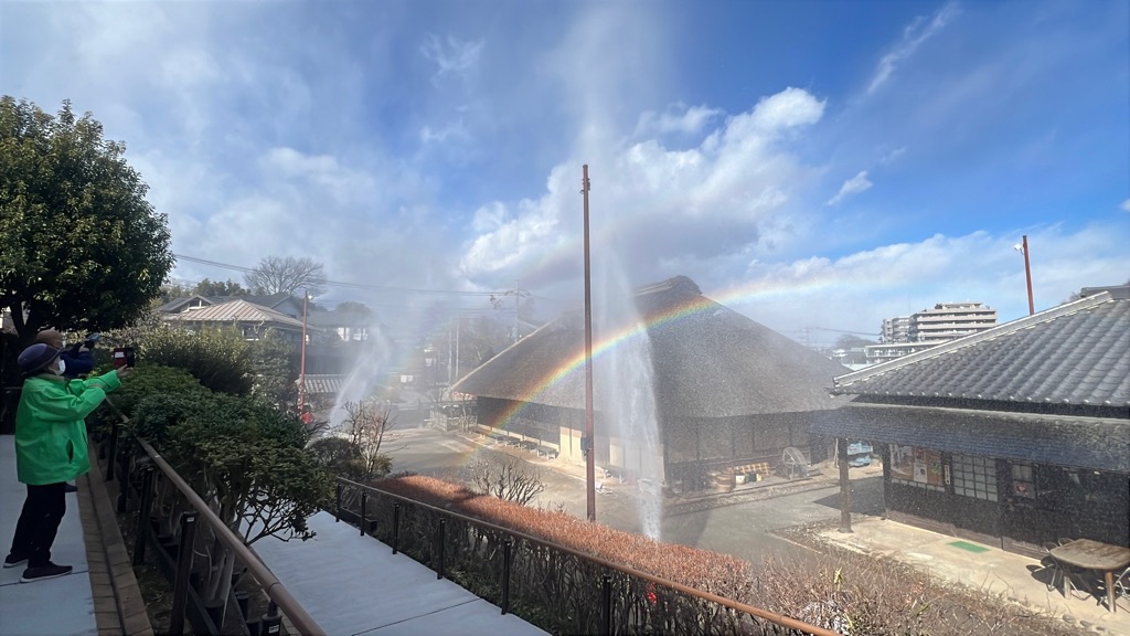 最後に、主屋(旧冨岡家住宅:市指定文化財)が火災となったときに発動する放水銃の試運転を行いました。本来有事の時にのみ発動するものですが、訓練時に見るとその水圧は圧巻で見ごたえがあります。